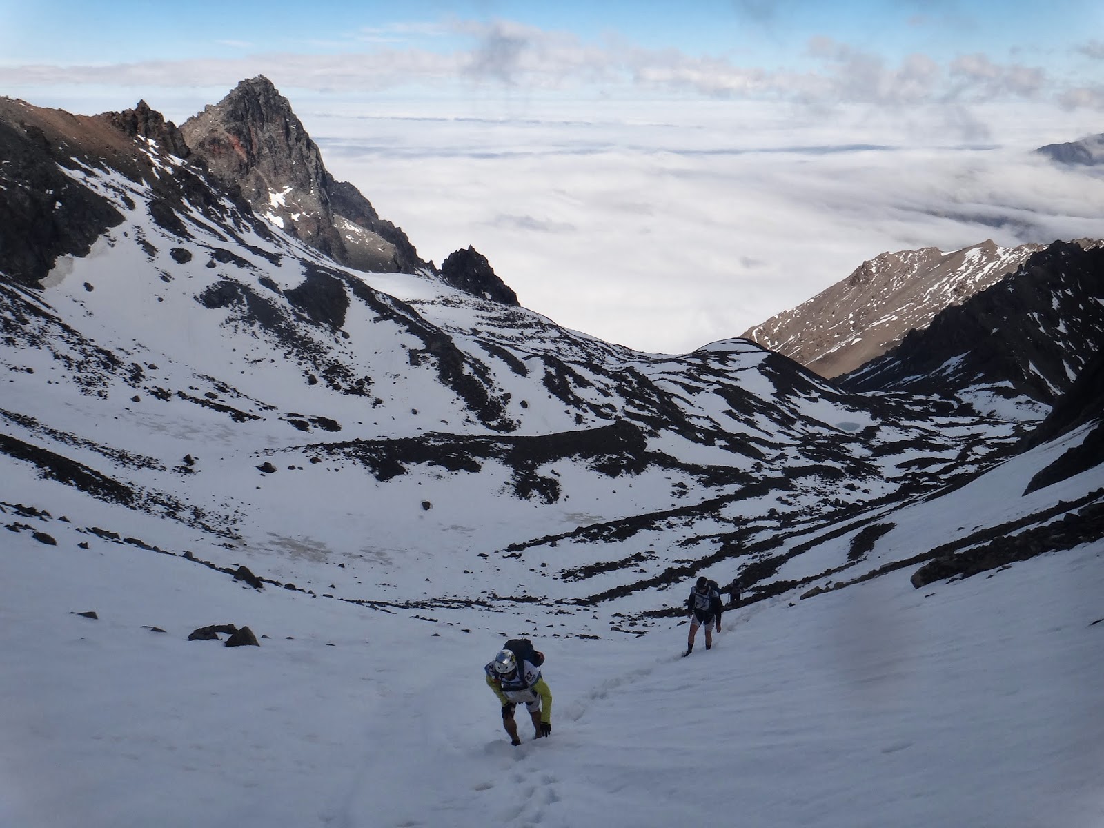 Tapuae-o-Uenuku, initially swathed in mist gradually gave us a clear view as reward for the relentless effort. Towering rock spires of the summit overlooked snowy peaks of the Seaward Ranges across the valley. The remoteness felt Himalayan. 5pm at the saddle gave us just enough daylight to descend the deep snow of the upper Hodder basins, following trails of blood from an injured party. The dangers of racing through alpine terrain were spelt out in red and white.